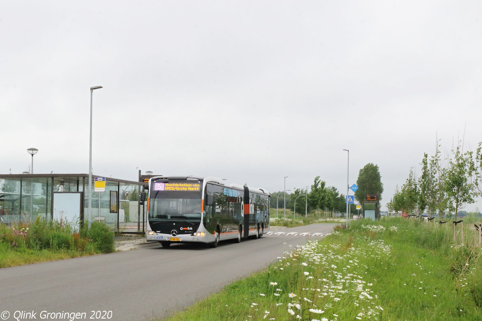 De Q-link Oranje Capacity bussen rijden sinds 2 juni 2020 samen met de Heuliez bussen op Q-link 5. De Oranje Capacity bussen zorgen tevens ook voor extra capaciteit voor de medewerkers van voornamelijk het UMCG die vanuit de P+R-locaties uit de stad naar het ziekenhuis reizen. Zoals hier bus 3407 die halteert bij P+R Meerstad op 4 juni 2020 en daarna op weg gaat richting UMCG en Annen op Q-link 5.