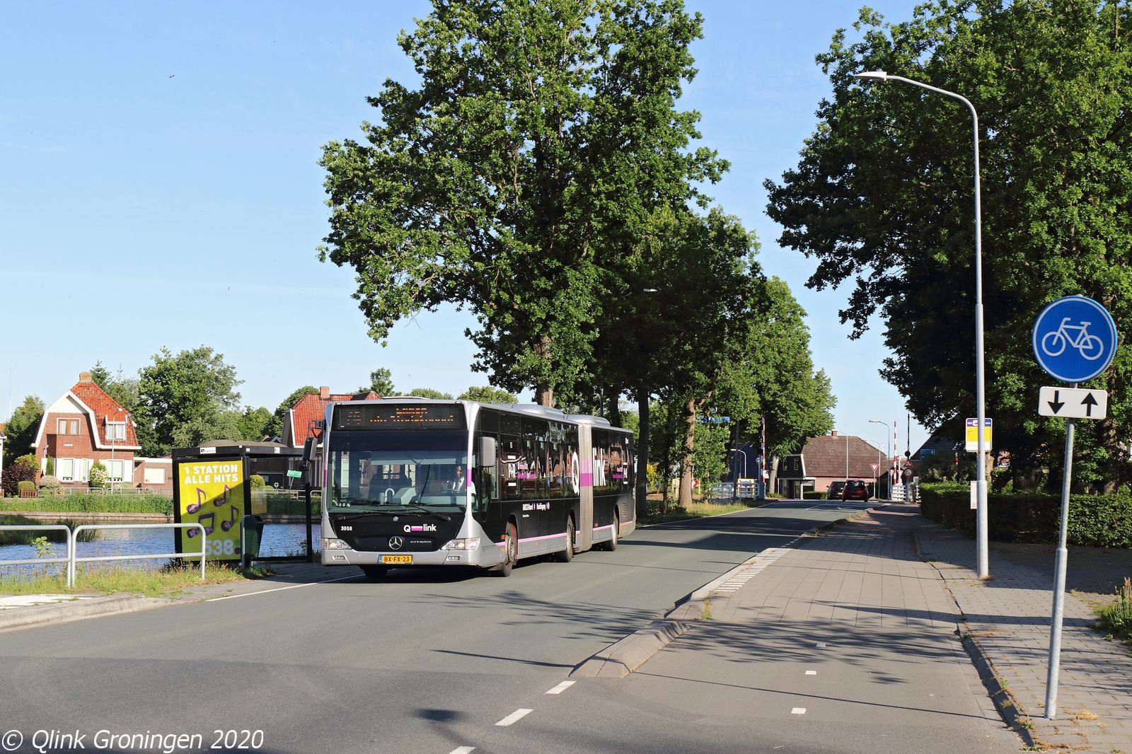 Na de rit op lijn 14 tussen Stadskanaal en Winschoten rijdt de oude Q-link Paarse bus door naar Veendam, waar hij enkele ritten op lijn 74 tussen Veendam en Emmen voor haar rekening neemt. Hierbij volgt de bus bijna de gehele route van het Stadskanaal. Op de foto van 2 juni 2020 begint de bus net aan de route van het Stadskanaal in Wildervank, terwijl bus 3058 de halte Bareveld Brug passeert.