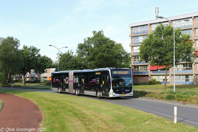 Per 1 juni 2020 rijden de bussen in het gehele Groningen en Drenthe gebied weer een normale dienstregeling. Ondanks dit kan slechts 40% capaciteit in de bussen worden geboden om te zorgen voor voldoende afstand tussen mensen. Om toch voor voldoende capaciteit te zorgen worden een negental oude Q-link Paarse bussen op de streekdienst ingezet en zijn te zien op allerlei lijnen in de regio. Op de foto is bus 3058 te zien bij de halte Veenhofsweg in Alteveer, waar hij op 2 juni 2020 halt houdt als hij op lijn 14 tussen Stadskanaal en Winschoten rijdt. Op deze lijn rijdt één rit per dag met een Paarse Q-link bus.