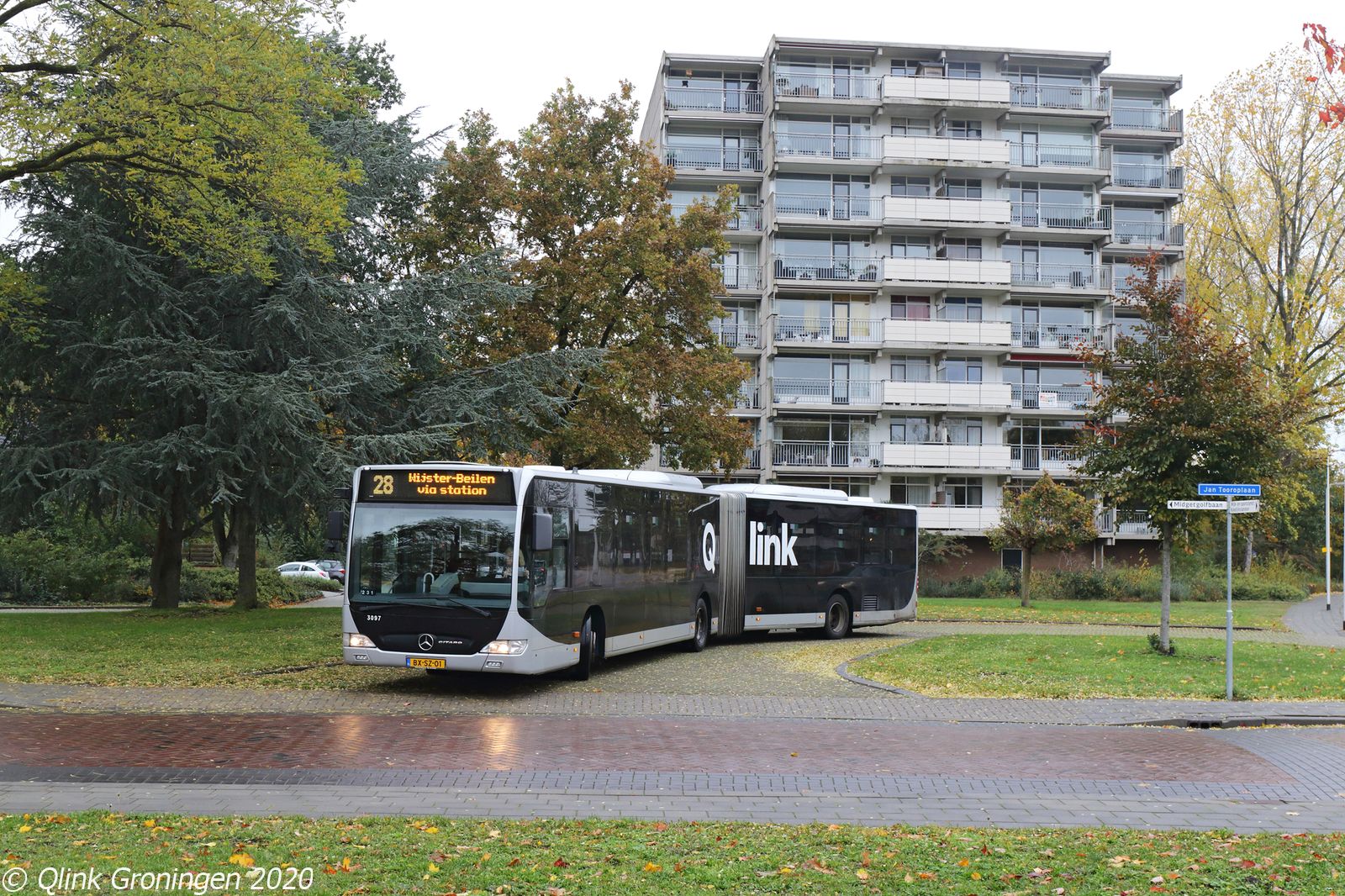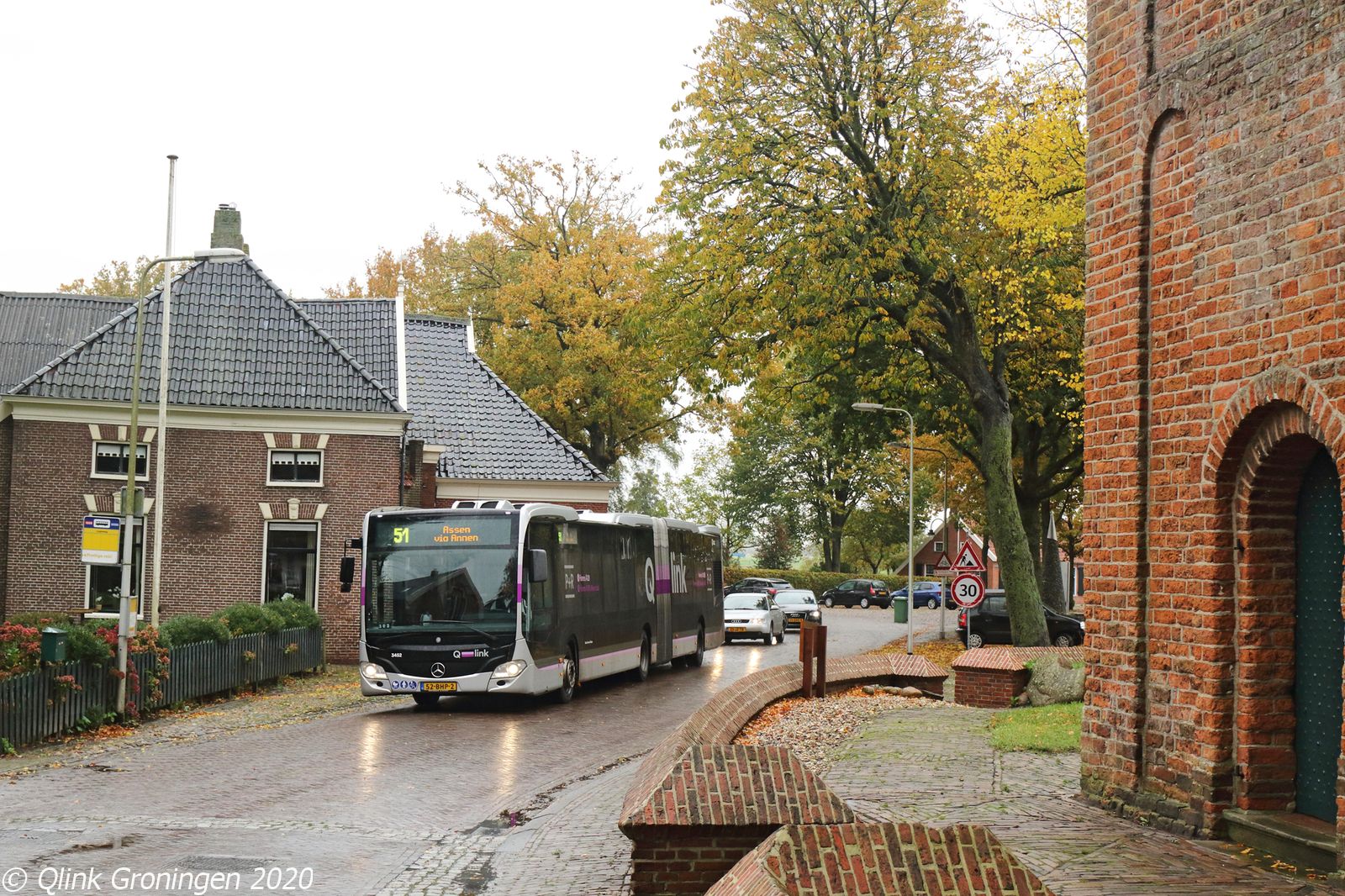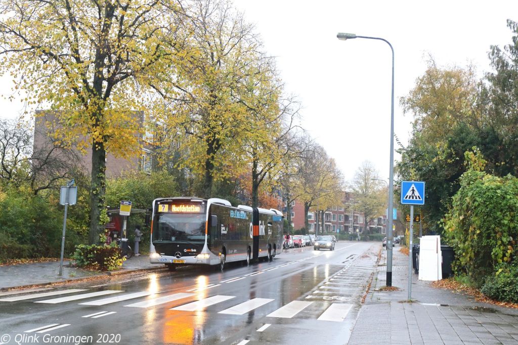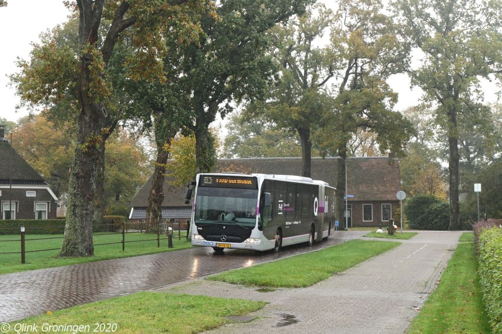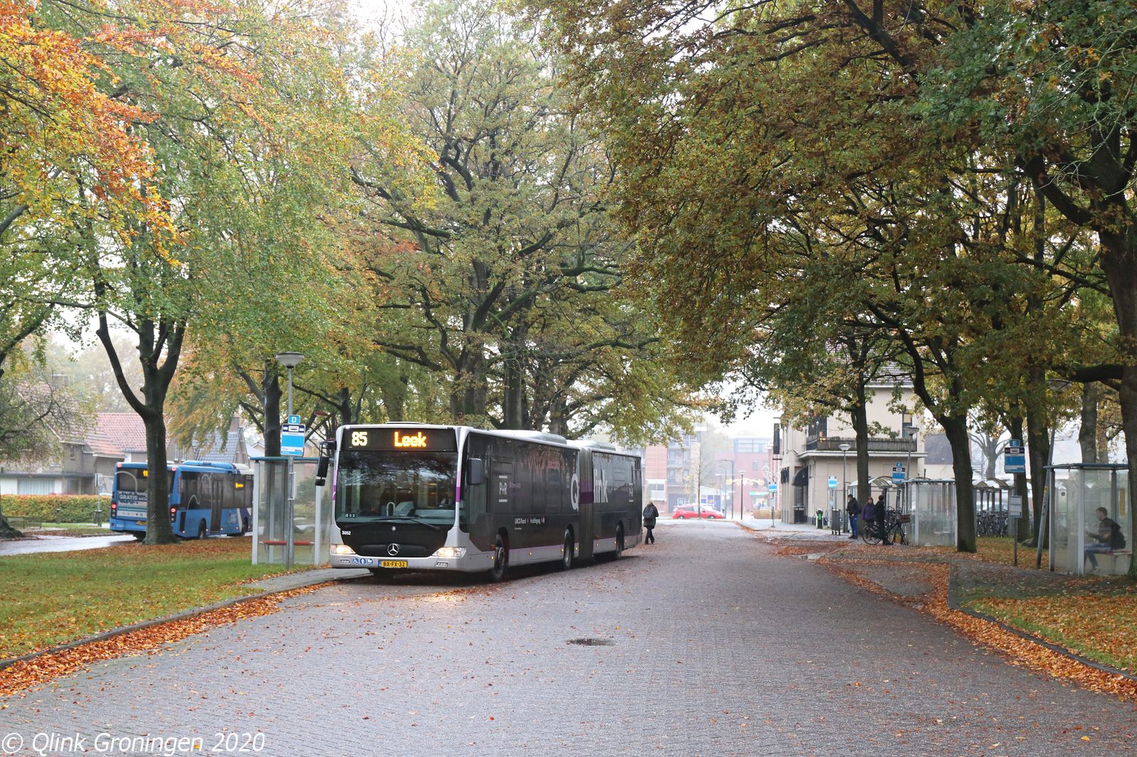 Op 4 november 2020 belandde de oude Paarse Q-link bus 3052 op zijn oude stamlijn Q-link lijn 5. Deze bussen die tot begin 2020 dagelijks op deze lijn te zien waren, rijden sinds de zomer van 2020 vooral op de streeklijnen wegens de coronacrisis. Op de foto komt de bus het tijdelijke oplaadpunt in Annen oprijden. Doordat deze pas in de loop van 2020 werden opgeleverd, hebben deze bussen nooit op dit eindpunt gereden. Nadat de bus is gekeerd en na een korte stop zou de bus weer vertrekken richting Groningen als Q-link 5.