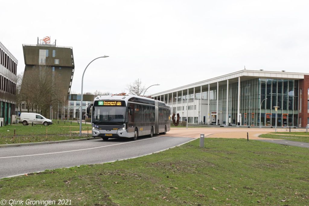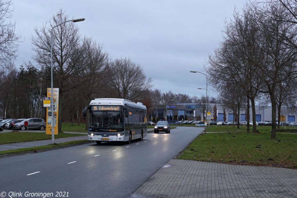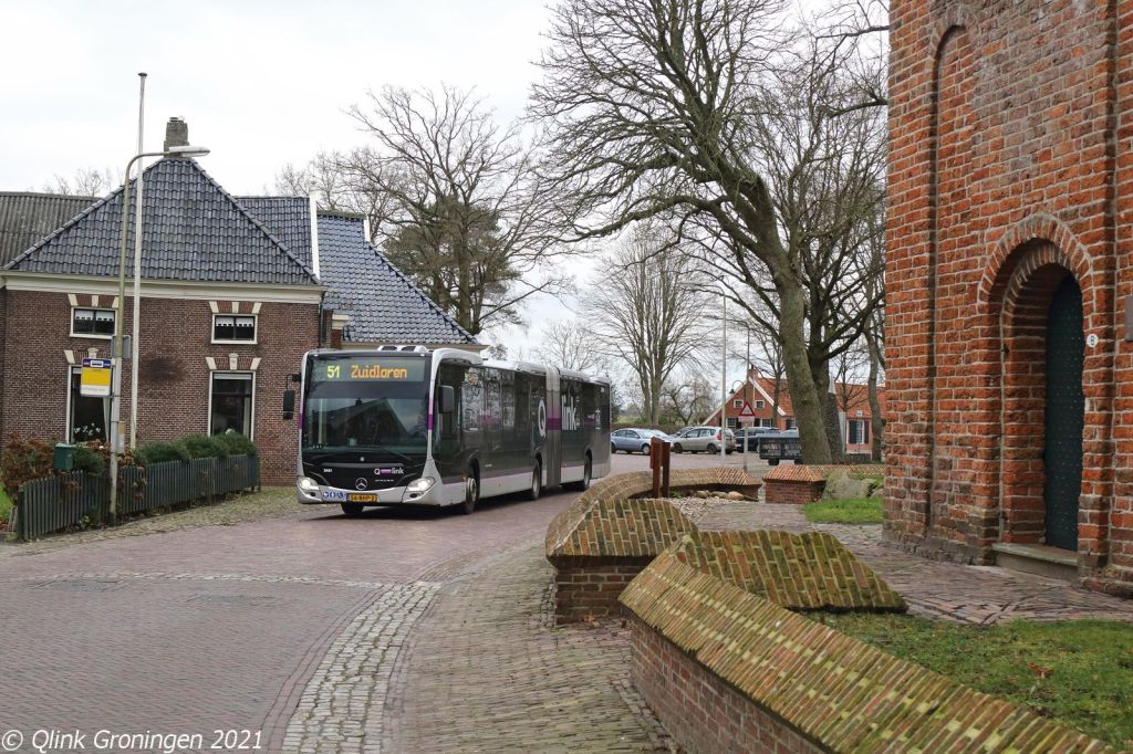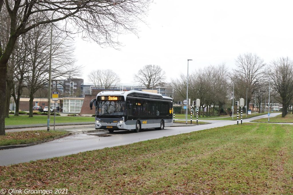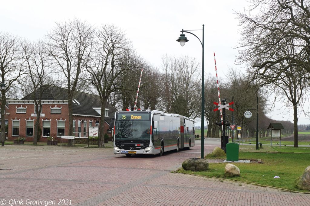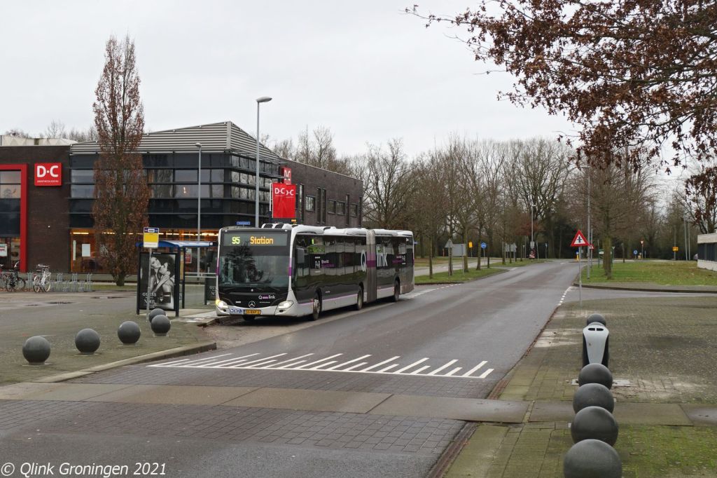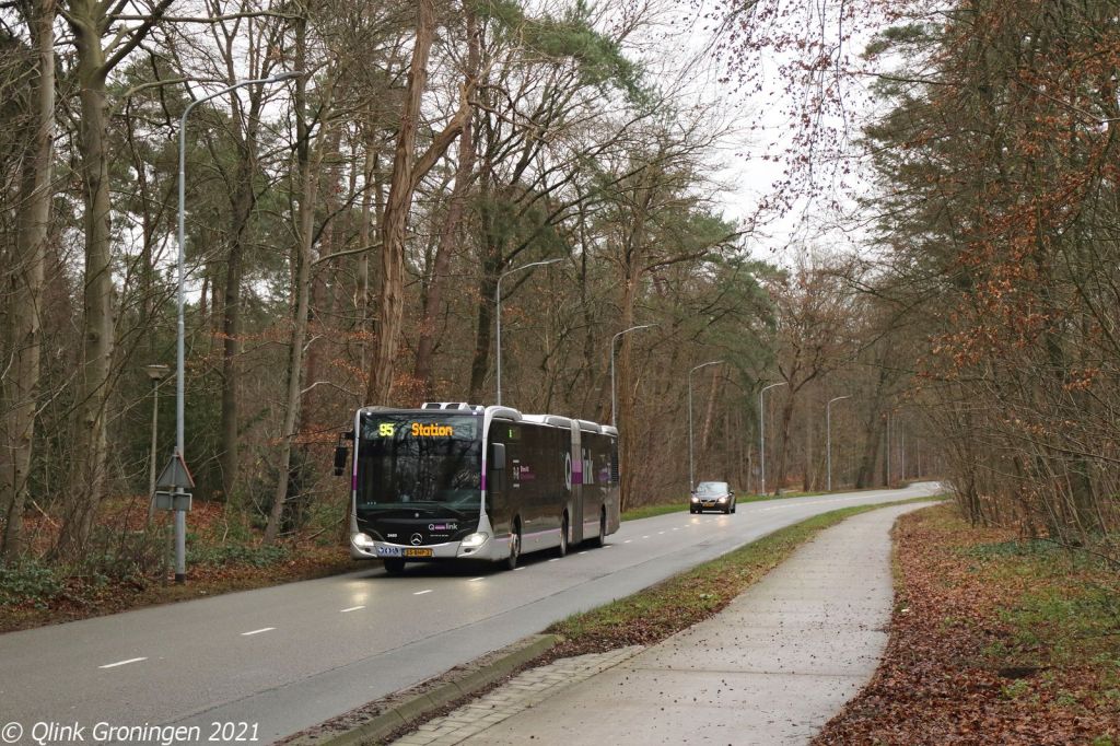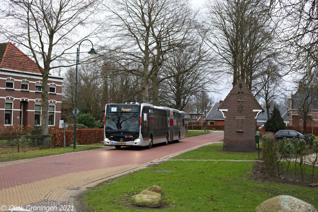 Zoals eerder vermeld, rijden ondanks dat het niet gepland is, diverse Q-link Paars bussen in Drenthe rond op omlopen van gelede streekbussen. Dit komt door de verminderde vraag van Q-link 6 en de verlaagde frequenties van enkele lijnen in Drenthe. De bussen zijn daardoor ook te zien op lijnen waarvoor ze voor de dienstregelingswijziging van 3 januari 2021 niet op hebben gereden. Zoals op de foto op lijn 59 tussen Emmen en Gieten, die onder andere langs de dorpen Exloo en Odoorn rijdt. Bus 3458 komt hier op 4 januari 2021 voorbij de halte Borgakkers in Borger en is op weg naar Gieten.