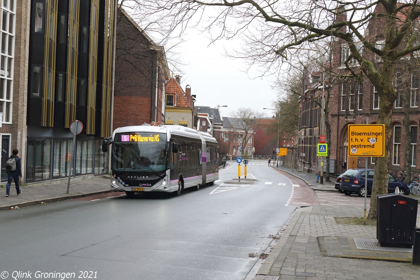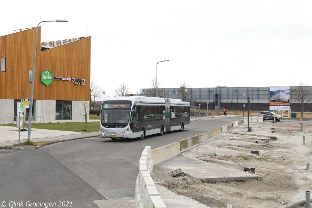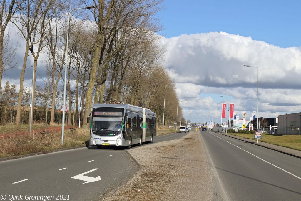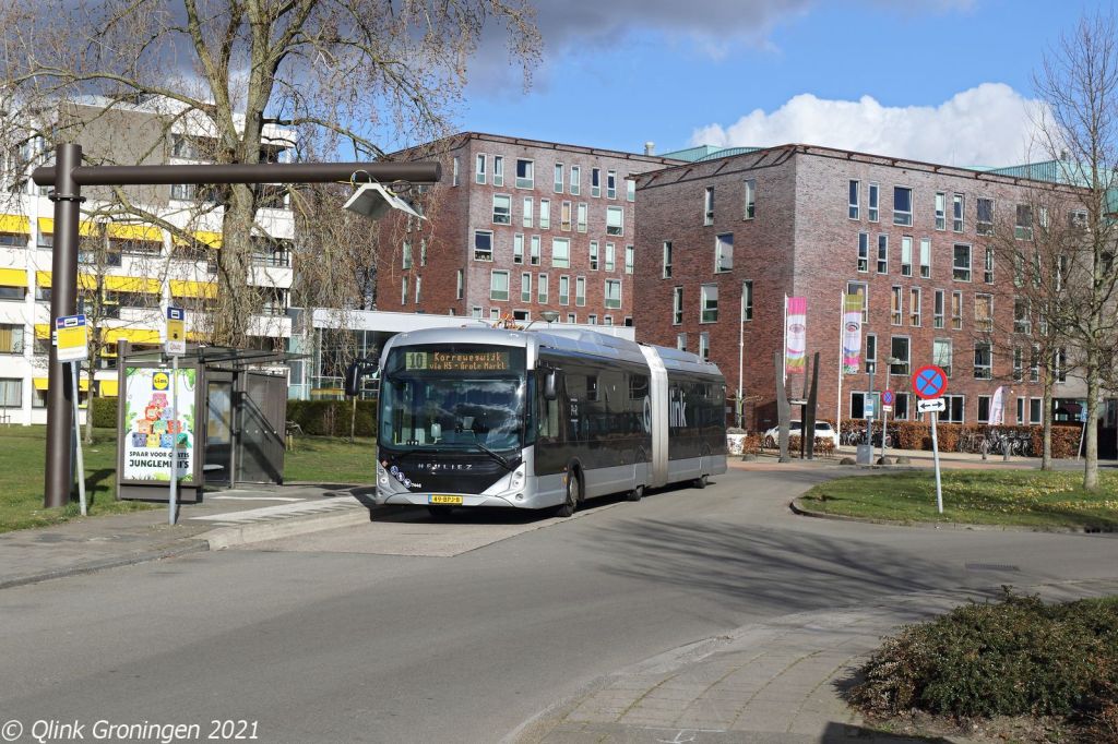 Na de Heuliez op Q-link 5, werd nog even gewacht om even verderop op de Grote Markt Q-link 6 te fotograferen, die op weg was naar Delfzijl. Deze lijn, die al sinds het begin via het Kattendiep en Damsterdiep rijdt, is een vreemde verschijning op deze locatie. Door de eerder genoemde werkzaamheden voor de nieuwe brug bij het Kattendiep rijdt deze lijn ook om. Op de foto komt bus 3461 over de Grote Markt gereden en is op 28 maart 2021 als Q-link 6 op weg naar Delfzijl.