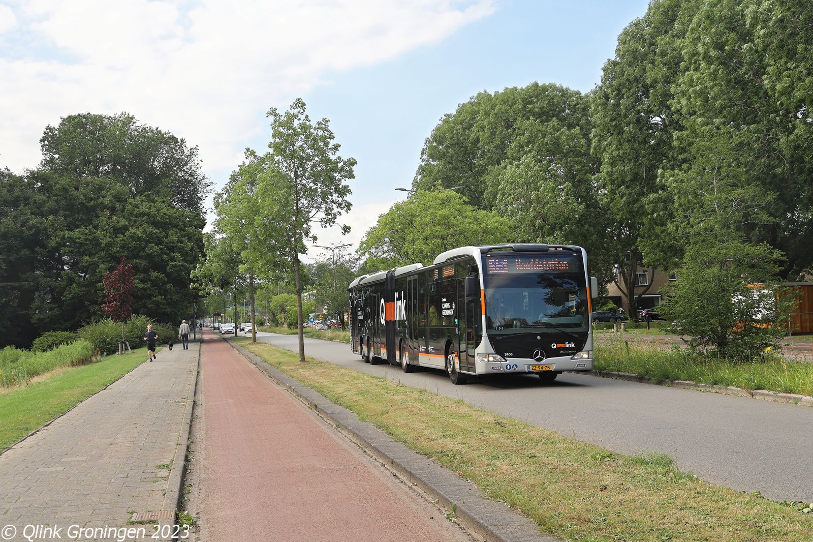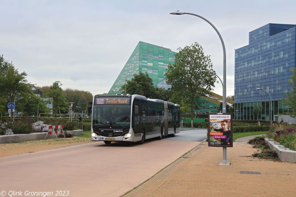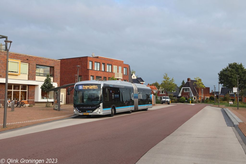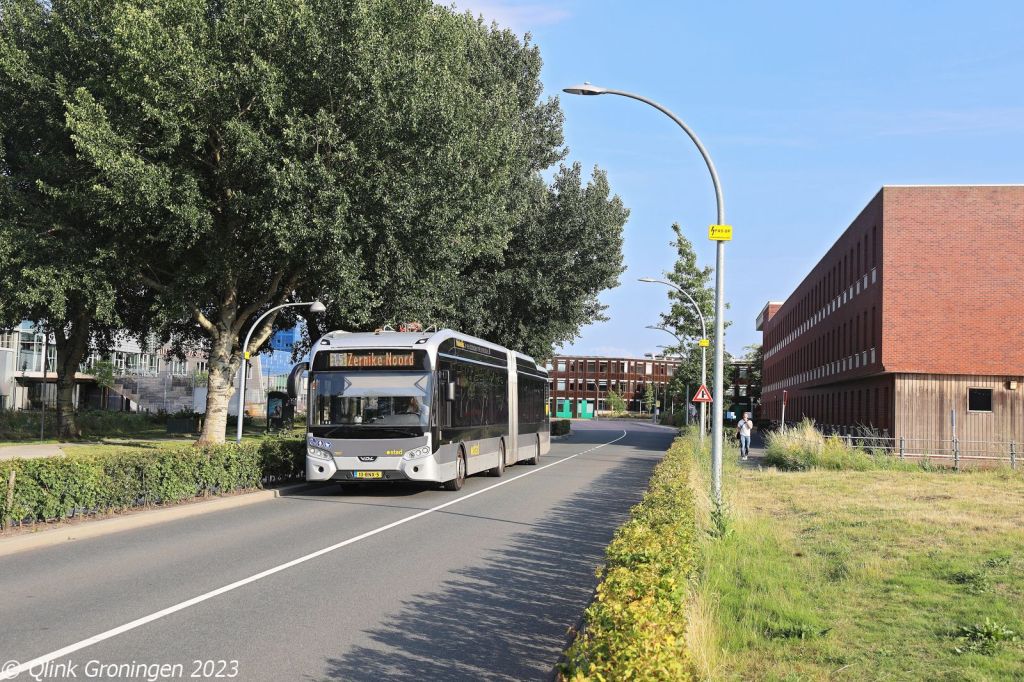 Na de Q-link reservebus op Q-link lijn 15 reed op 20 september ook een andere bijzondere bus op Q-link Oranje. Het betrof een elektrische Heuliez-bus in de Q-link Blauwe kleurstelling. Dagelijks rijdt sinds september 2023 een Blauwe Heuliez in de ochtend op deze lijn om de drukte op deze altijd drukke studentenlijn op te vangen. Hierdoor komen voor het eerst geplande Heuliez-bussen op Zernike. Op de foto op de Zernikelaan passeert bus 7419 als hij met een compleet volle bus bijna het eindpunt bij Zernike Noord heeft bereikt.