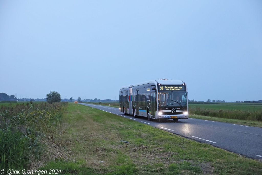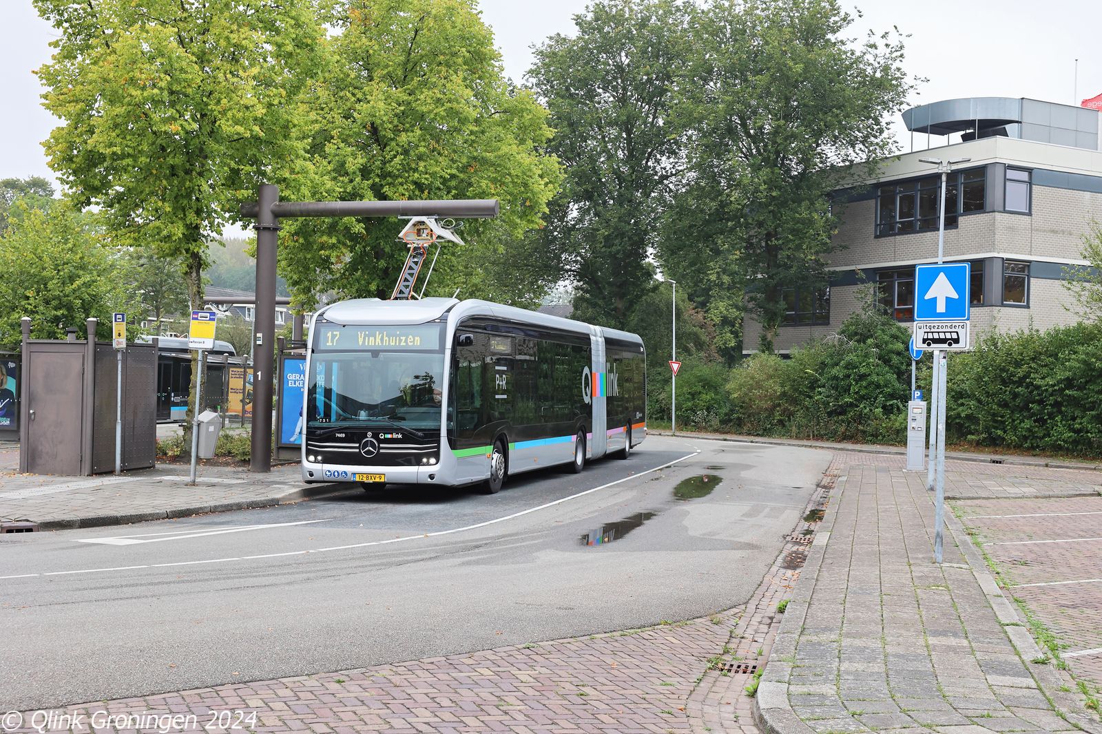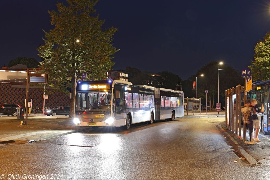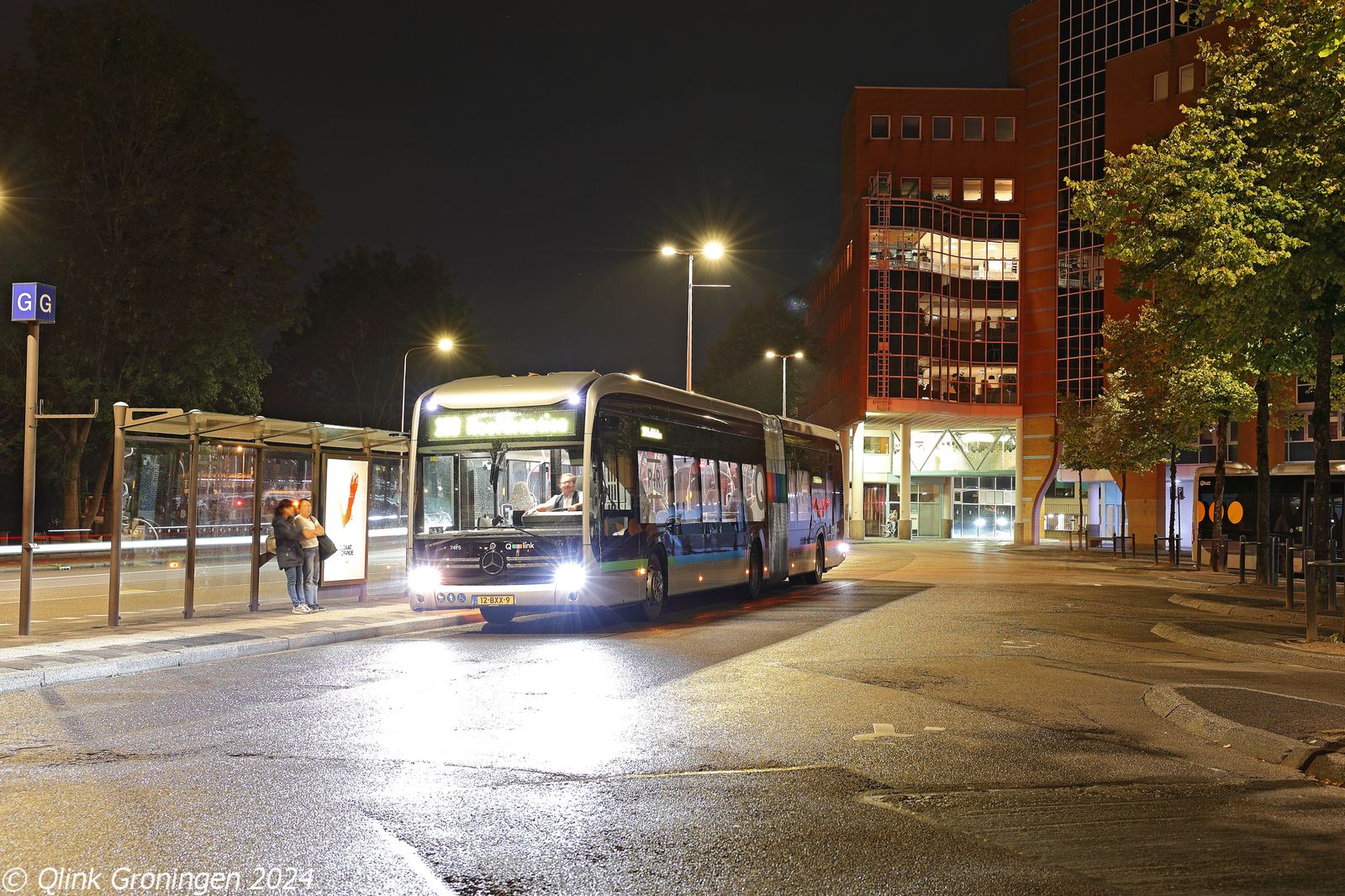 Naast de inzet van een Q-link Mercedes eCitaro op lijn 51 en lijn 163, reed er ook een andere Mercedes Q-link eCitaro-bus op de streekdienst. Dit betrof bus 7475, die actief was op streeklijn 163 tussen Groningen en Lauwersoog. Dankzij de extra staanplaatsen in deze bussen zijn ze, vanwege de grote hoeveelheid bagage die op deze lijn wordt meegenomen, zeer geschikt voor deze route. Op de foto van 6 september 2024 is de bus in de avonduren net aangekomen op het station van Groningen. Nadat de passagiers zijn uitgestapt, zal de bus vertrekken naar de stalling om op te laden.