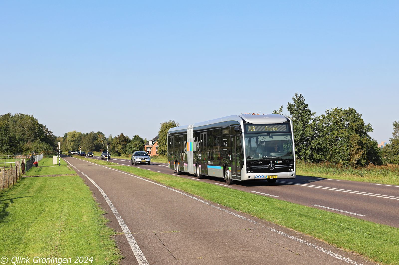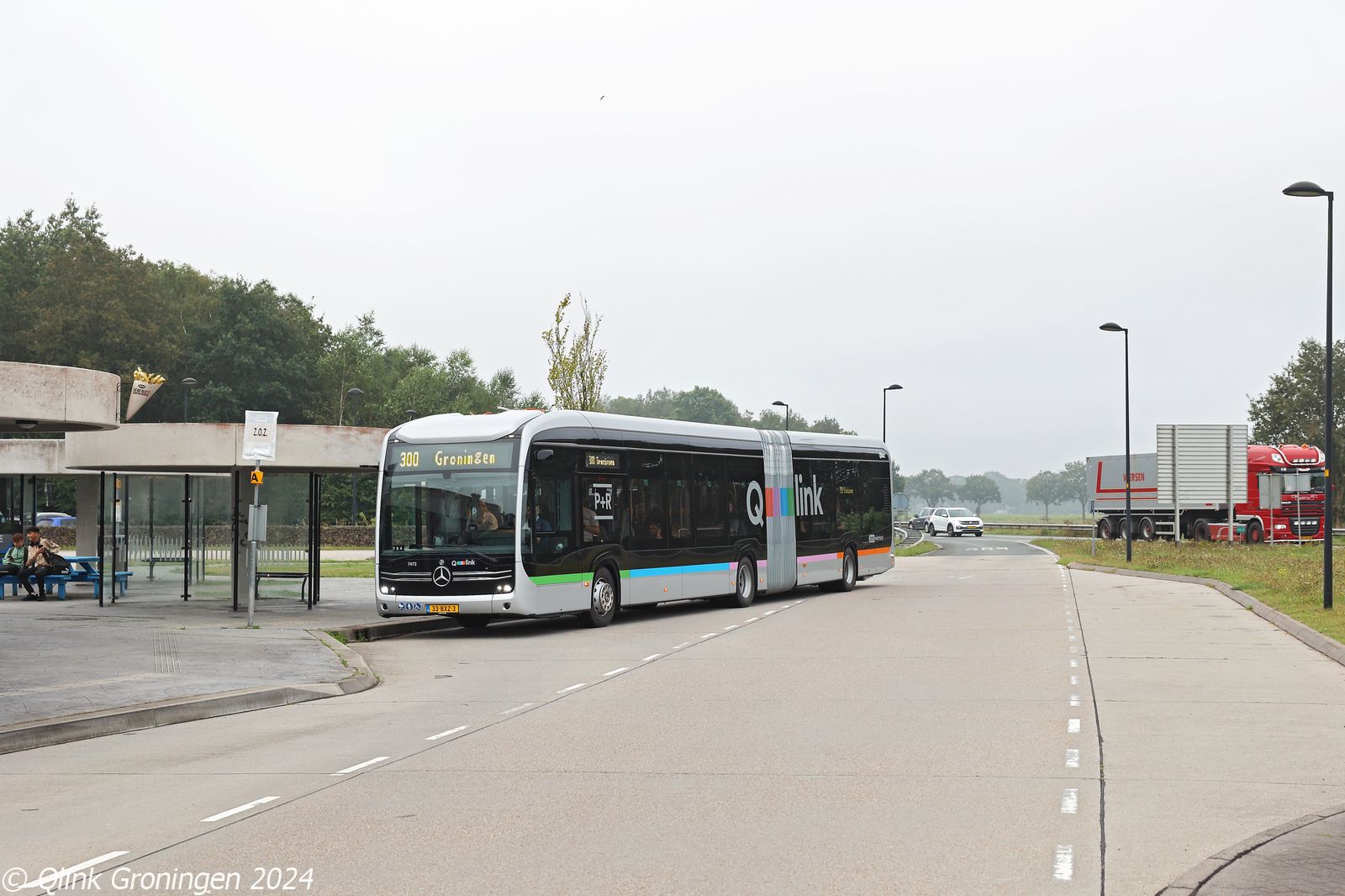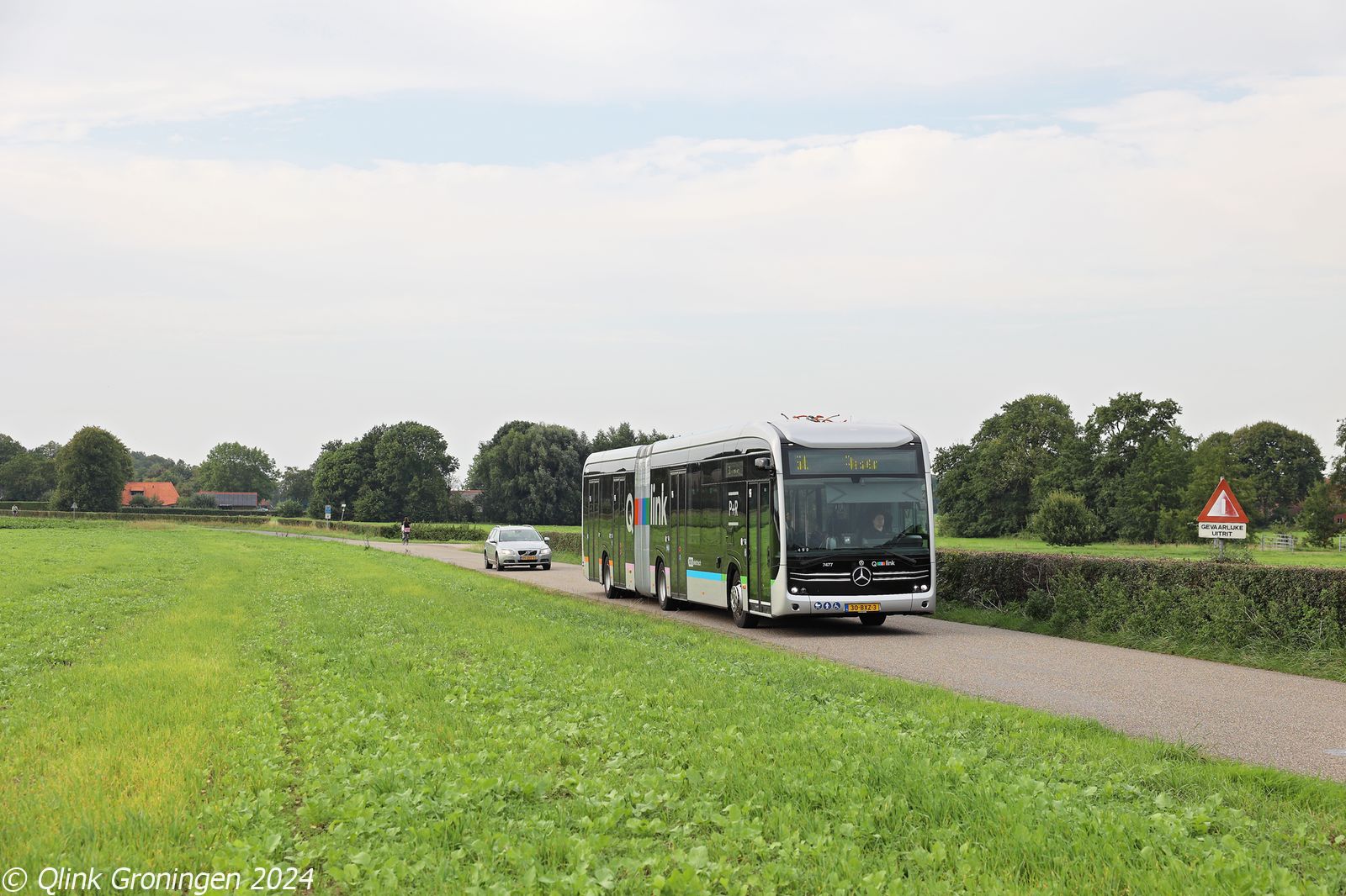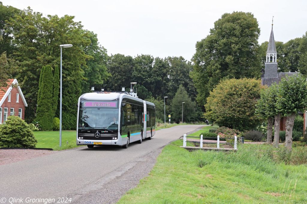 Naast de inzet van een Q-link Mercedes eCitaro op lijn 51 en lijn 163, reed er ook een andere Mercedes Q-link eCitaro-bus op de streekdienst. Dit betrof bus 7475, die actief was op streeklijn 163 tussen Groningen en Lauwersoog. Dankzij de extra staanplaatsen in deze bussen zijn ze, vanwege de grote hoeveelheid bagage die op deze lijn wordt meegenomen, zeer geschikt voor deze route. Op de foto van 6 september 2024 is de bus in de avonduren net aangekomen op het station van Groningen. Nadat de passagiers zijn uitgestapt, zal de bus vertrekken naar de stalling om op te laden.