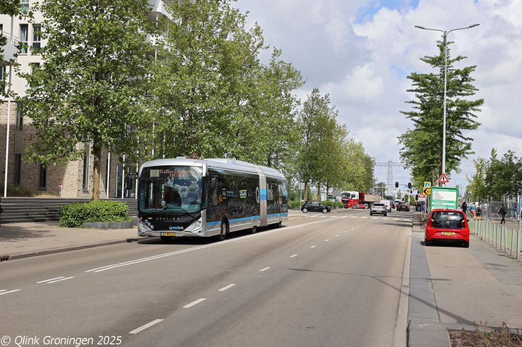 Zoals eerder beschreven, is Q-link lijn 2 momenteel erg druk vanwege de werkzaamheden rondom Spoorzone Groningen. Waarbij de meeste treinen eindigen tijdelijk op station Europapark. Omdat deze situatie deels werd voorzien, is tijdens de spitsuren een tijdelijke lijn 12 in het leven geroepen. Deze lijn rijdt rechtstreeks tussen station Europapark en de Zernike Campus (en vice versa), en vormt daarmee een directe tegenhanger van Q-link lijn 15. Op de foto van 22 mei 2025 is Blauwe Q-link bus 7427 te zien, rijdend op lijn 12 over de Boumaboulevard. De bus is bijna bij zijn eindpunt, station Europapark, als hij de fotograaf passeert.