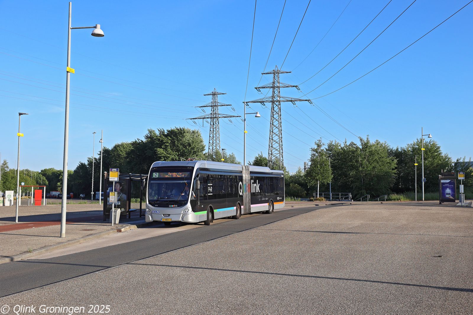 Wegens de operatie Spoorzone Groningen eindigen veel treinen tijdelijk op station Europapark. Als gevolg daarvan rijden er extra ritten op Q-link-lijn 2 tussen station Europapark en P+R Reitdiep. Deze extra ritten vinden ook plaats in het weekend en in de avonduren, als tijdelijke vervanging van Q-link-lijn 1, die zoals eerder vermeld tussen 10 mei en 6 juli 2025 niet rijdt. Door de werkzaamheden is Q-link 2 zo druk geworden dat er inmiddels nóg meer extra ritten zijn toegevoegd. Op de foto van 20 mei 2025 is bus 3474 te zien bij de halte P+R Euroborg/P3, in de late avond. De bus is hier op weg als Q-link 2 richting P+R Reitdiep.