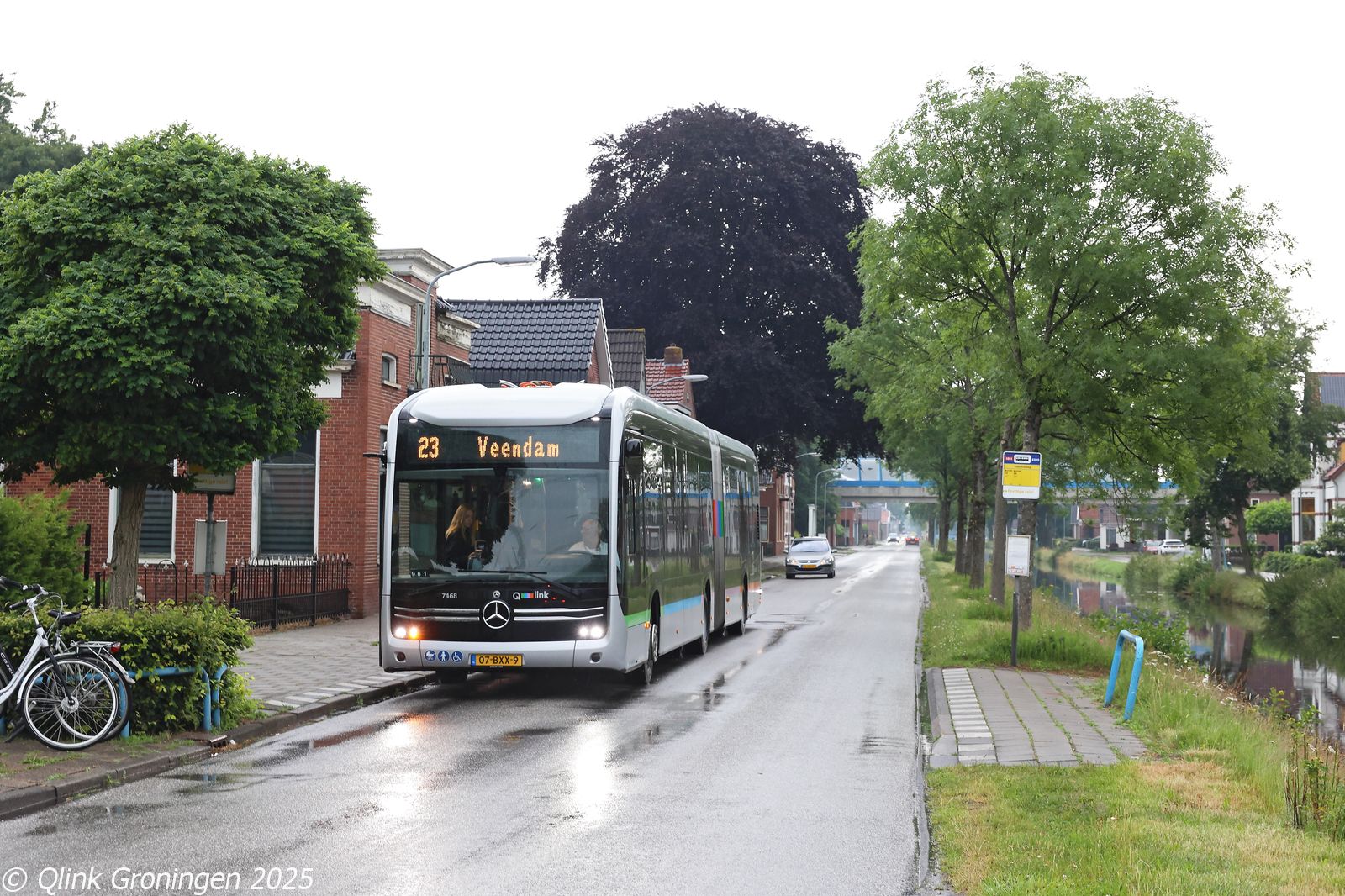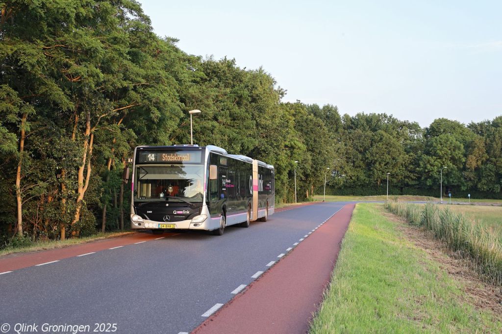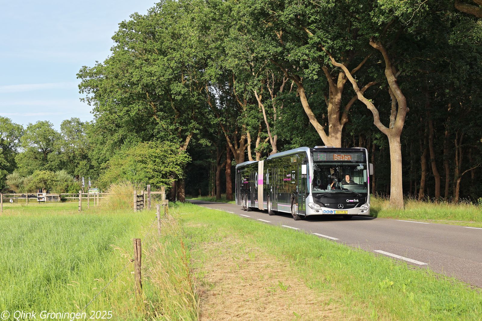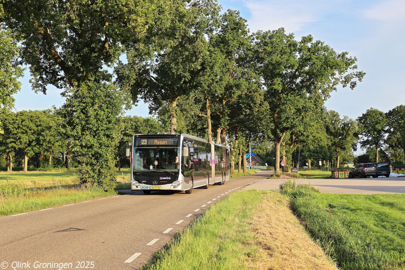 Na het pendelritje op lijn 22 tussen Westerbork en Beilen, werd bus 3412 ingezet op een andere lijn die alleen tijdens het TT-evenement rijdt: lijn 23. Deze lijn verbindt Westerbork met Assen via een rechtstreekse route door het kleine plaatsje Zwiggelte, waar normaal gesproken geen lijnbus meer doorrijdt. De inzet van een 21 meter lange bus op dit traject is dan ook een extra opvallende verschijning. Op de foto van 27 juni 2025 passeert bus 3412 op de Halerweg in Zwiggelte en is onderweg via Hooghalen naar Assen.