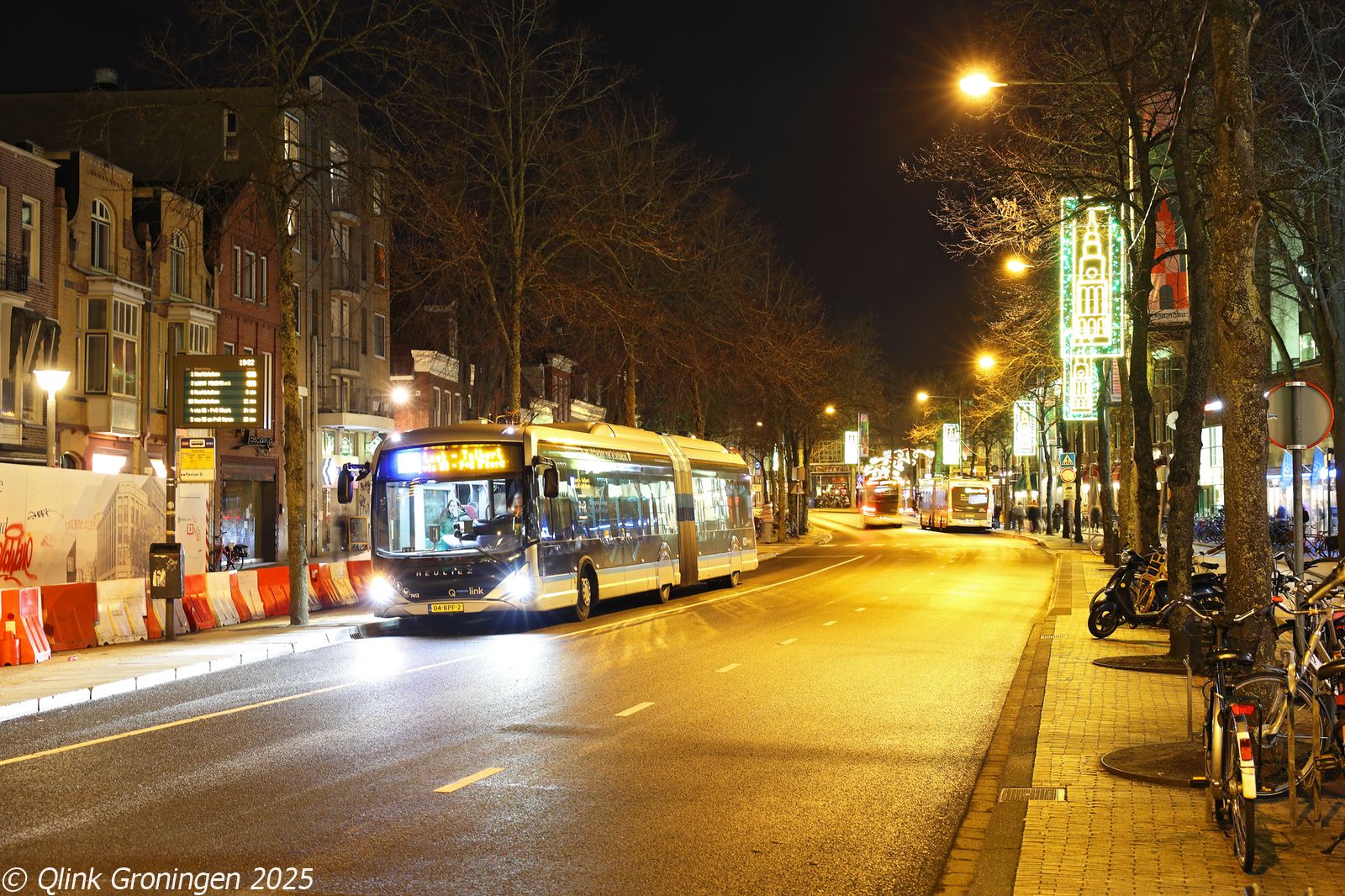 Na meerdere jaren werd er, mede dankzij de nieuwe kerstverlichting die in 2024 in het centrum van de stad Groningen is geplaatst, aan het eind van 2025 weer een foto gemaakt voor de serie ‘Q-link in het donker’. Op het Zuiderdiep zijn ook nieuwe banieren geplaatst, die de straat extra verlichten. Deze hebben hier allemaal de vorm van de Martinitoren, zoals op de foto te zien is. Aangezien dit één van de straten is waar de meeste Q-link-lijnen doorheen rijden, kon een avondopname hier niet achterblijven. Op 30 december 2025 staat bus 7413 gereed bij de halte Zuiderdiep en zou zo dadelijk als Q-link 3 vertrekken richting Leek, terwijl hij de fotograaf passeert.