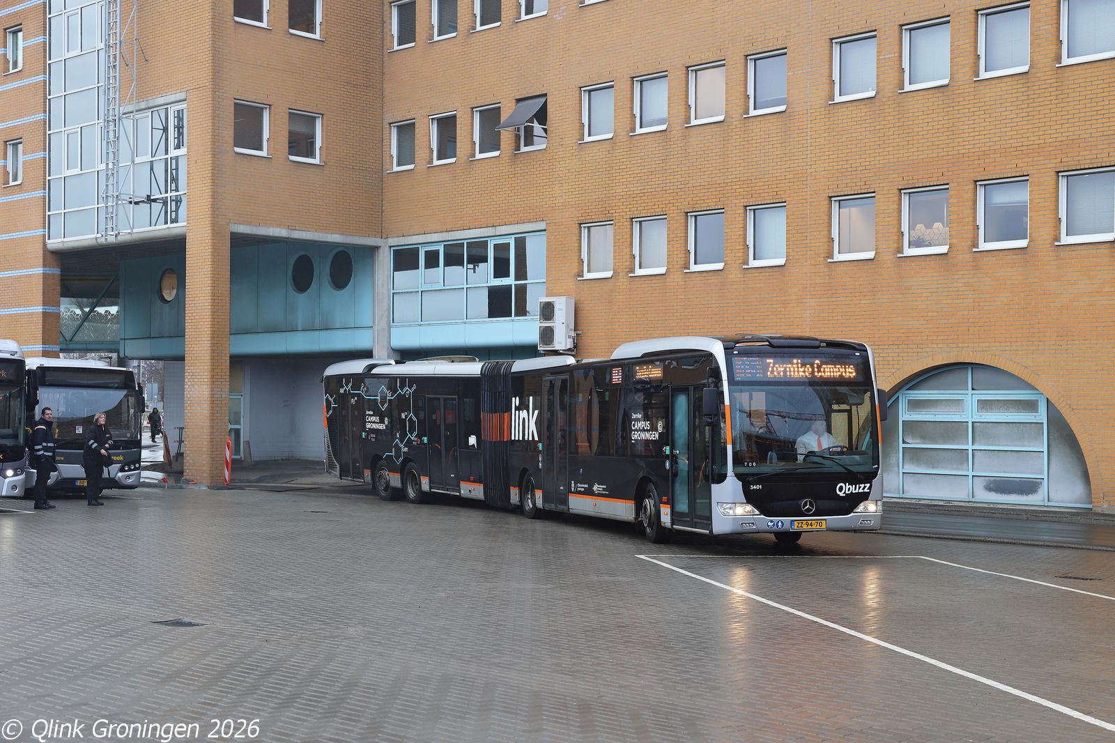Wegens de bouw van de tunnel tussen de Stationsweg in Groningen en het nieuwe busstation aan de achterzijde van het station, is halverwege vorig jaar de bufferlocatie verplaatst van de oude plek naar de voormalige sporen 1b, 2b en 3b van het treinstation. Dit geldt als tijdelijke oplossing totdat het nieuwe busstation in gebruik wordt genomen. Omdat deze locatie minder ruimte biedt dan de voormalige bufferplek, maken van de Q-link lijnen momenteel alleen de bussen van Q-link 15 gebruik van deze tijdelijke locatie. Op de foto is Oranje Capacity bus 3401 te zien op Q-link 15, terwijl hij op 27 februari 2026 een rondje rijdt over de tijdelijke bufferlocatie. Na een korte stop zou hij weer vertrekken richting Zernike Campus.