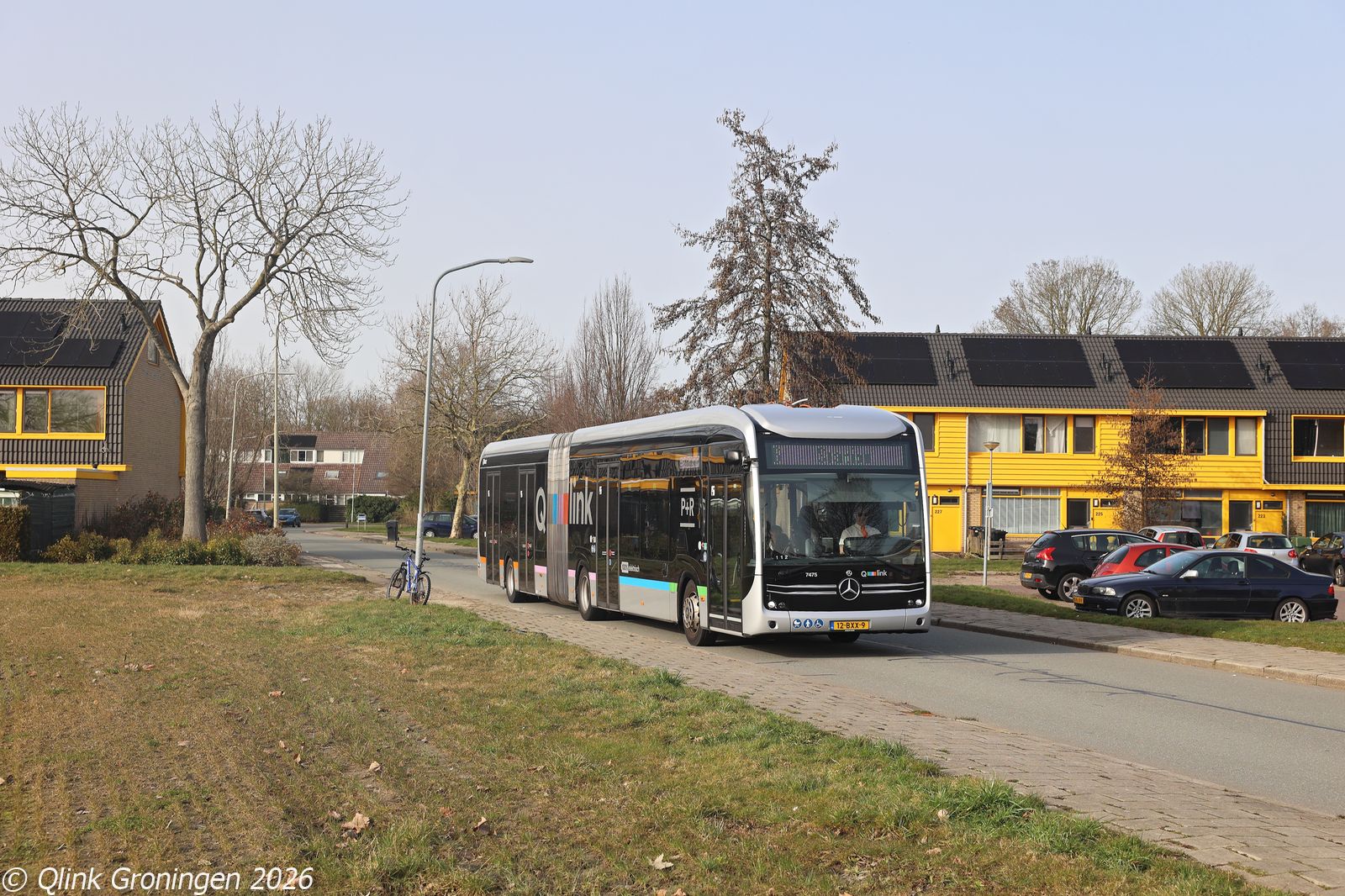Wegens werkzaamheden aan een spoorwegovergang aan de Kustweg in Delfzijl reed Q-link 6 tijdelijk via een omgeleide route door Delfzijl-Noord. Hierbij reed Q-link 6 vanaf de Kustweg weer via de oude route over de Skagerrak en de Eemsweg, echter nu in tegengestelde richting naar station Delfzijl toe en vice versa. In 2019 werd deze route verlaten ten gunste van een snellere route langs de Hogelandsterweg in Delfzijl. Destijds reden echter diverse typen bussen nog niet op Q-link 6, zoals bijvoorbeeld de Q-link eCitaro-bussen. Eén van deze bussen, met het nummer 7475, passeert hier op de foto ter hoogte van de voormalige halte Skagerrak en is op weg richting station Delfzijl op 6 maart 2026.