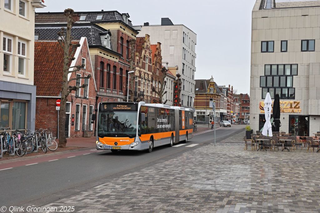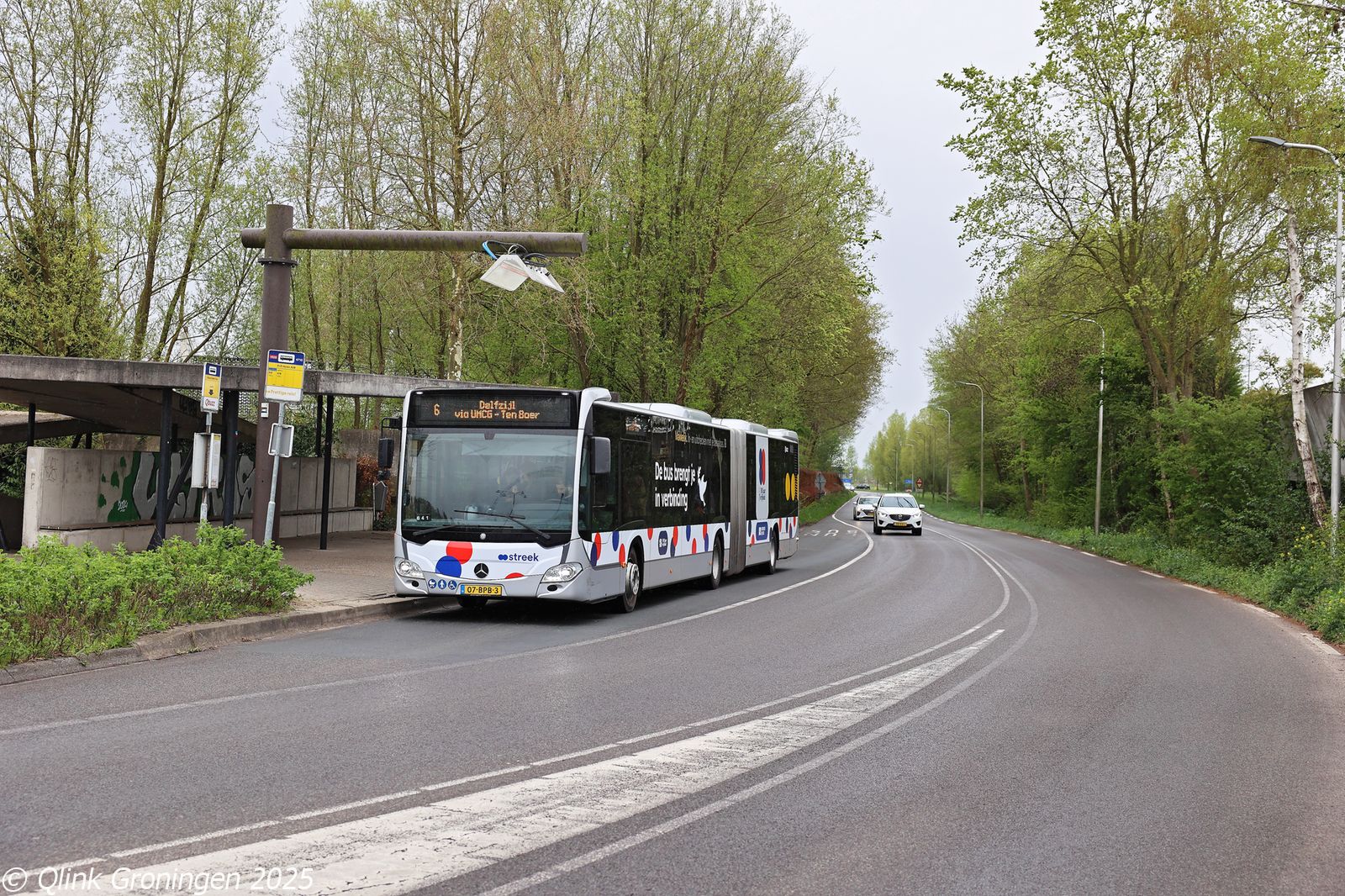 Zoals eerder vermeld, worden sinds december 2023 meerdere ritten op Q-link lijn 6 tussen Groningen en Delfzijl (en vice versa) gepland uitgevoerd met de nieuwe Q-link eCitaro’s. Deze ritten vinden meestal plaats in het weekend en tijdens periodes waarin de vakantiedienstregeling van kracht is. Inmiddels zijn deze elektrische bussen een vertrouwd gezicht op deze lijn, waarbij ook de lijnfilm inmiddels de juiste kleur weergeeft. Op de foto van 19 april 2024 passeert bus 7469 de halte Kustweg in Delfzijl en is onderweg richting Groningen.