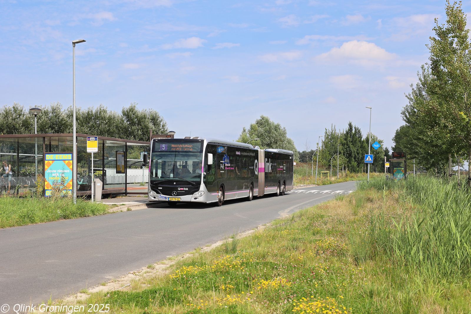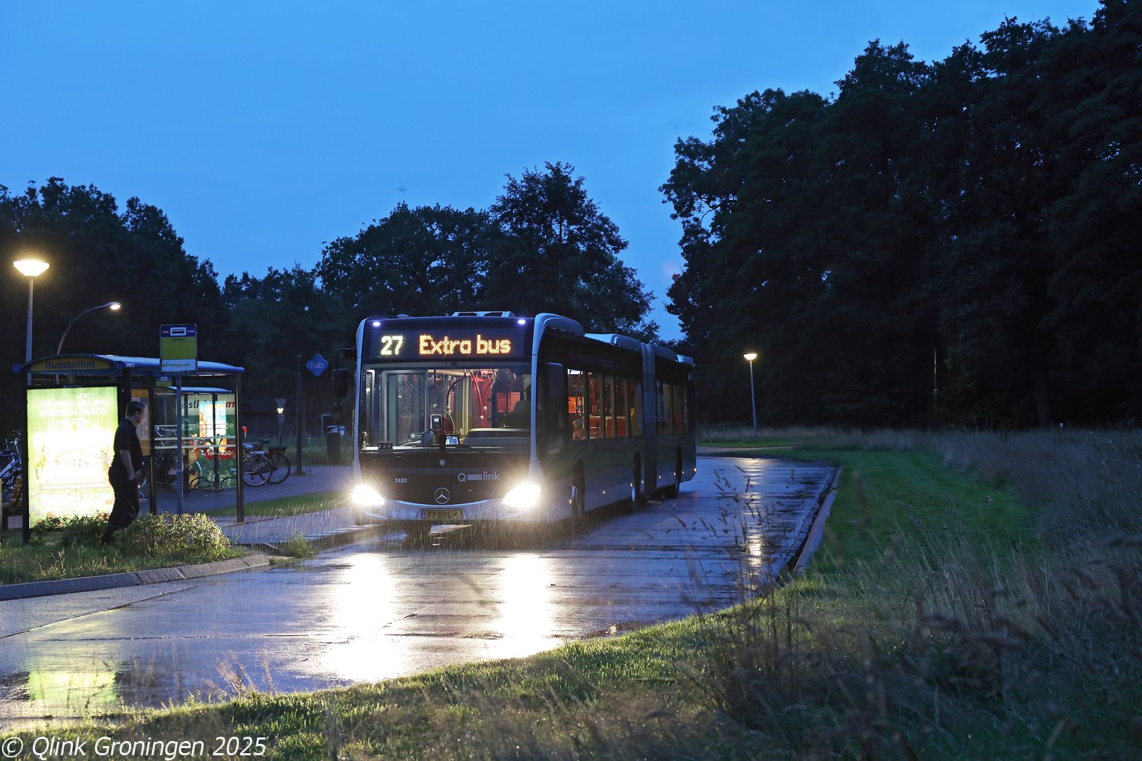Nadat voor de zomervakantie een inmiddels in een streekjasje gestoken Q-link Paars bus werd ingezet op lijn 209, die tussen Groningen Airport Eelde en het station van Groningen rijdt als spitslijn, verscheen er na de zomervakantie regelmatig een Q-link Oranje Capacity bus op deze verbinding. Dat is bijzonder, aangezien enkele jaren geleden nog werd aangegeven dat de gemeente Tynaarlo liever geen gelede bussen in Eelde wilde zien. Nu rijden er zelfs de extra lange Capacity bussen. Op de foto van 28 augustus 2025 passeert bus 3405 de halte Steenakkersweg in Eelde en is onderweg als lijn 209 richting Groningen.